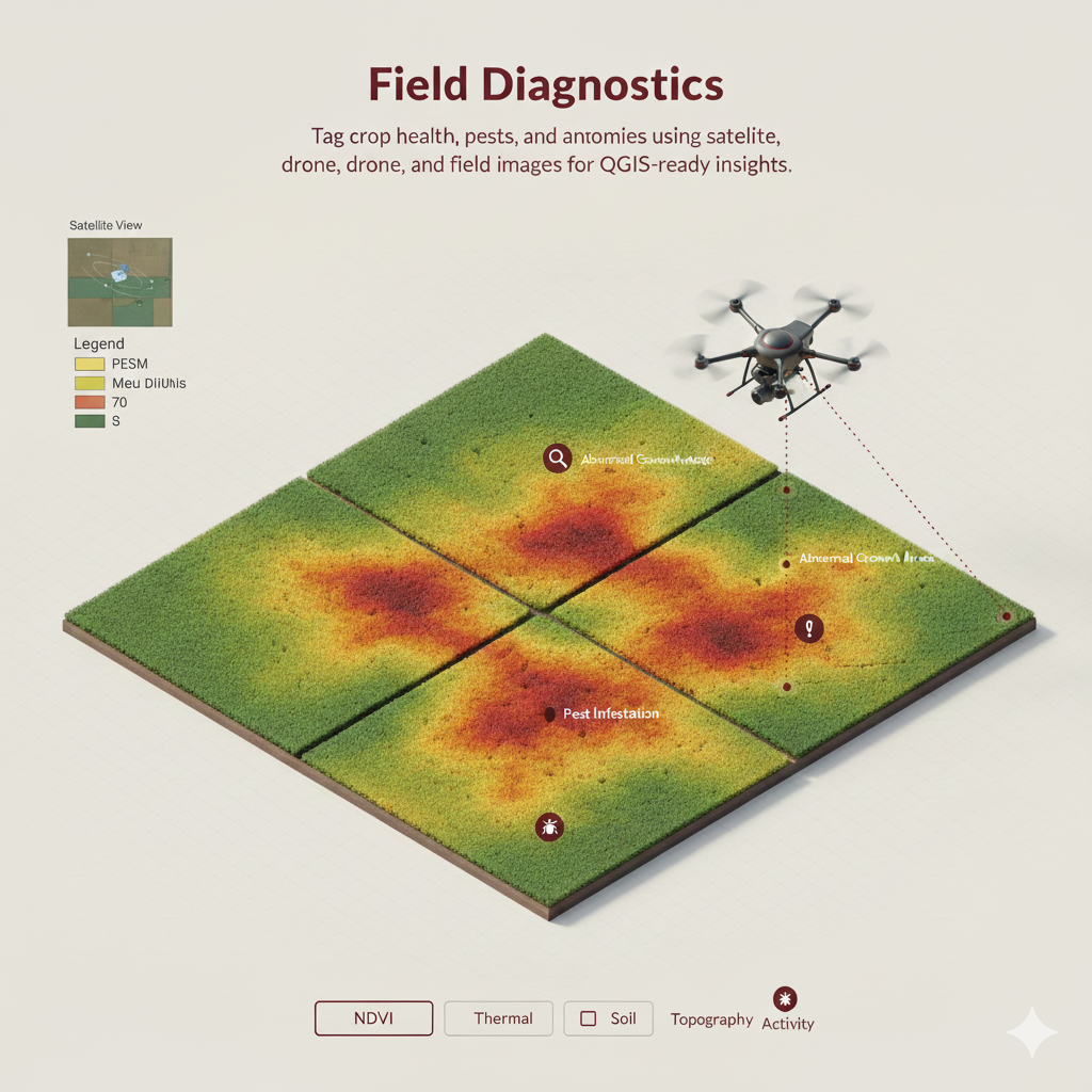 Tag crop health, pests, and anomalies using satellite, drone, and field images for QGIS-ready insights.